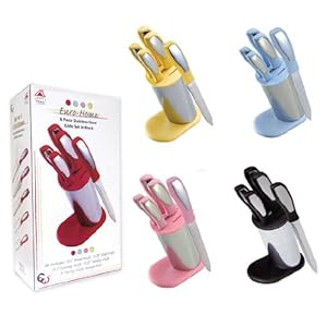 Our 6-piece set stainless steel knife block set stocks a kitchen with most cutlery needs, and packs all knives in a contemporary pink stainless steel storage block. The set includes: 13.5" Bread Knife, 13.75" chef's knife, 13.5" carving knife, 10.25" utility knife, 9" paring knife and 9.25 x 7"" knife block. Knives and block feature 2 tone stainless steel and pink plastic adding a finishing touch to your kitchens decor. A magnificent set for yourself or gift. The only one of its kind sold on Amazon. Also sold in red, yellow, black and blue on Amazon.