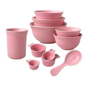 025398047352 Features: -Small measuring cup capatity: 1/4 cup.-Medium measuring cup capacity: 1/2 cup.-Large measuring cup capacity: 1 cup.-Extra large measuring cup capacity: 7/3 cup.-Microwave and dishwasher safe.-Caution: Not safe for oven baking. Includes: -Set includes gadget crock, spoon rest, five mixing bowls and four measuring cups. Construction: -Stoneware construction. Color/Finish: -Pink color. Dimensions: -Spoon rest dimensions: 9.5'' Depth.